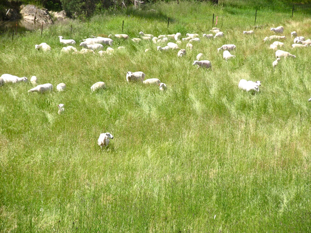 Milkwood Farm creek flat with cell-grazed sheep, made lush in part from periodic spraying with diluted ‘liquid gold’