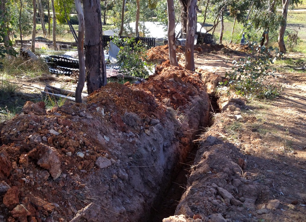 Once the panels were up, it was time to dig a trench down the hill to the house to run the power cables down. We also needed to run the gravity fed drinking water from the shed down to the house.