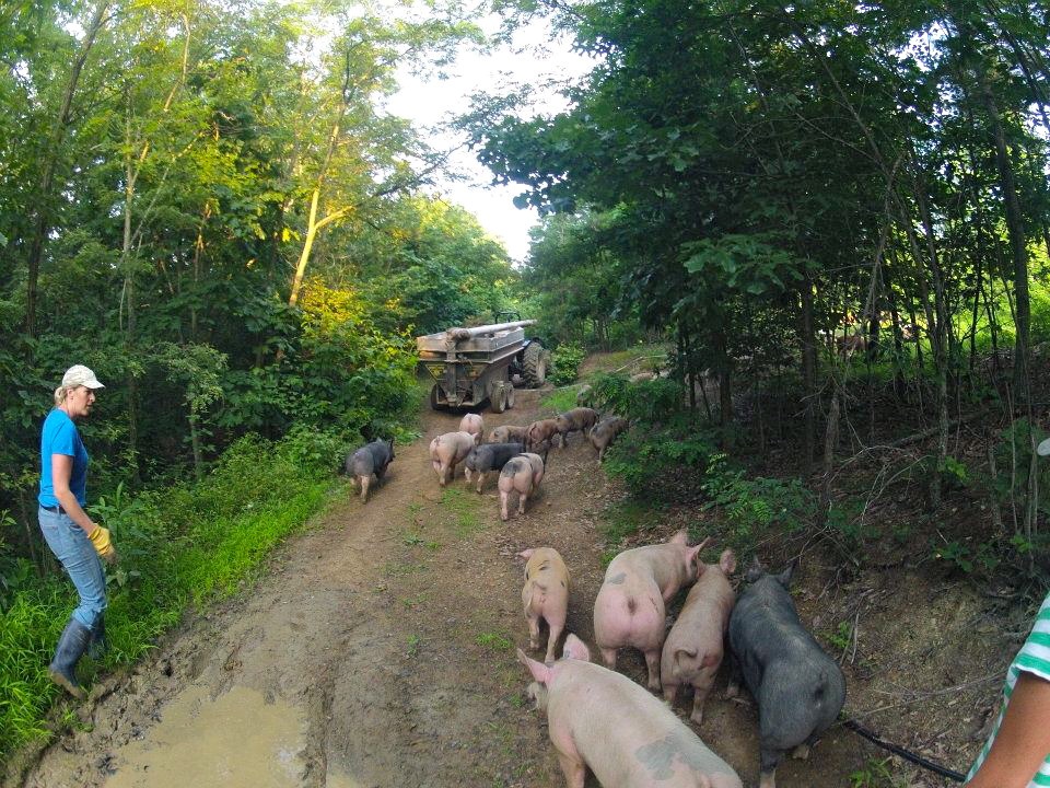 So what does moving a mob of pastured pigs look like, and how does it work? Our friend Derek has just finished up interning at Joel Salatin’s Polyface Farm, and he sent us some photos of a recent ‘pig move’.