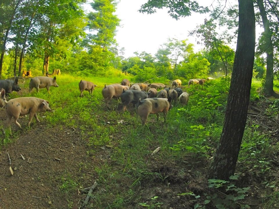 Happy pastured pigs, off to do their piggy thing, rooting in the ground for tasty treats and stimulating the seedbank as they do it