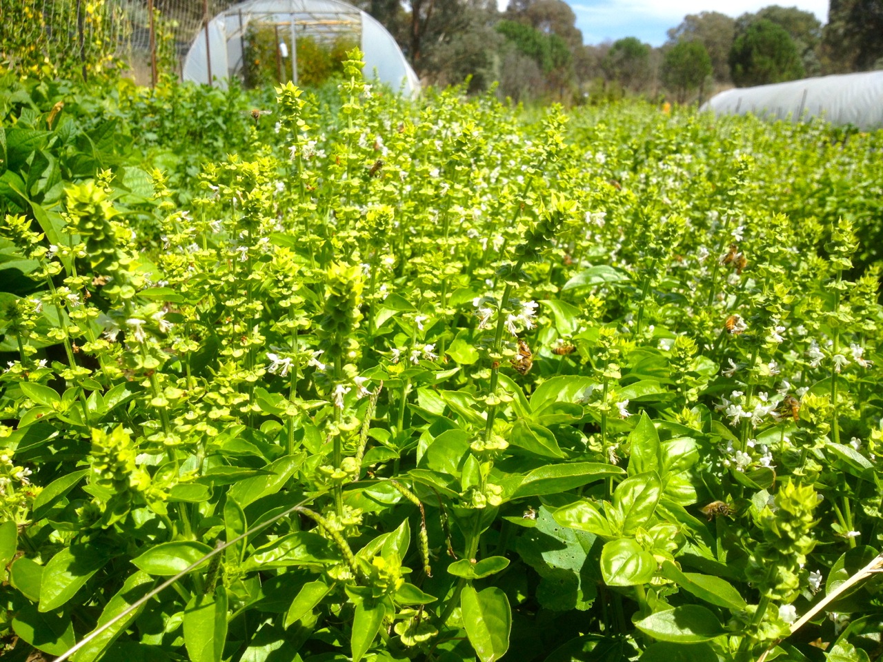 Bees on the basil at Allsun Farm