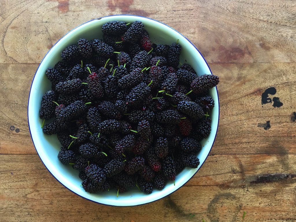 I’m looking down at this bowl of mulberries that Nick just went and picked from my tree.