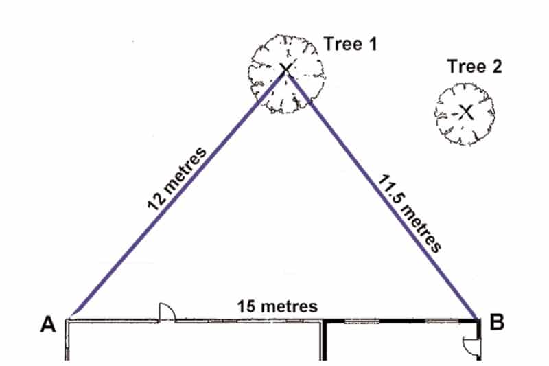 Next, we use our tape to measure the distance from A to Tree 1 and B to Tree 1 and record those distances on the sketch. In this example the measurements are 12 metres and 11.5 metres respectively.