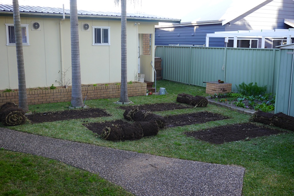So I’m simply harvesting everything from each bed, removing the bed surround, raking out the soil a little to meet the surrounding grass, and then adding grass seed in quantity, along with random kikuyu grass runners to help things along.