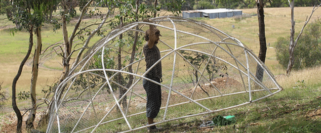 Maybe you’re already familiar with that classic Permaculture tool known as the Chicken Tractor / Chook Dome system. No? Awright – in a nutshell: In this context, a Chicken Tractor is any structure that can be moved from place to place in a garden with a bunch of chickens housed in it. The chickens living in the tractor do what chickens are so good at: scratching up the soil and turning it over, making short work of any greenstuff to be found, and spreading their manure the length and breadth of the space available to them (not to mention producing eggs and more chickens).